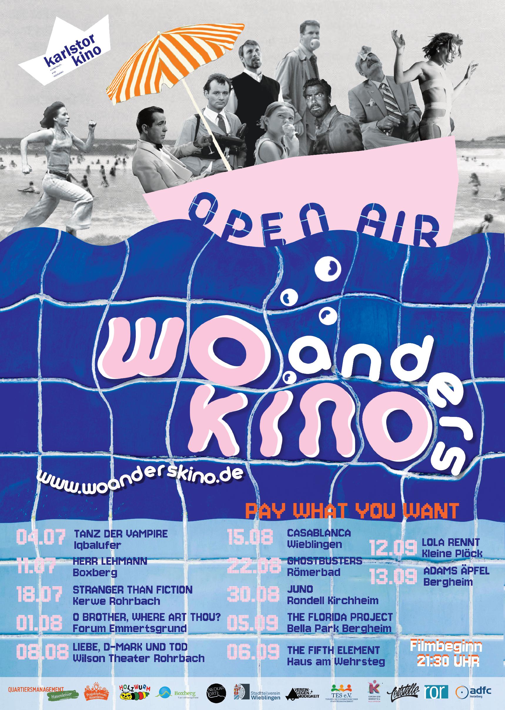 Das WoAndersKino macht Kino anders. Auch 2025 heißt es: Raus aus der Blackbox, rein in die Stadt! Wir holen Filme an ungewöhnliche Orte, und bringen das Kino direkt in die Stadtteile Heidelbergs. Von August bis September reisen wir mit Leinwand, Projektor und Soundanlage durch Heidelberg und zeigen, meist unter freiem Himmel, Filme, die auf besondere Weise zum Ort passen. Die Veranstaltungen werden kurzfristig hier, auf unserer Webseite www.woanderskino.de und in den sozialen Medien angekündigt. Beginn ist jeweils nach Sonnenuntergang. Es gilt das „Pay-what-you-want-Prinzip“, das heißt: Jeder bezahlt wie viel ihm/ihr der Kino-Abend wert war.